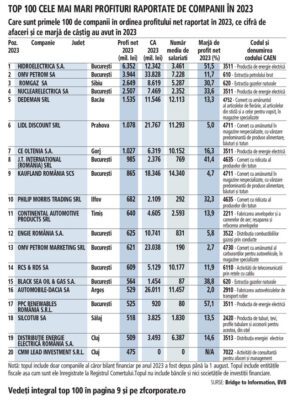ZF’de Miera Diaconu’nun haberinde Brige to Information platformuna dayandırdığı verilere göre kârlılıkta ilk sırada 12 milyar ley (2,41 milyar Euro) ciro ile 6,3 milyar ley (1,27 milyar Euro) kâr elde eden Hidroelectrica oldu. Şirket bir önceki yıl ise 4,3 milyar Ley kâr elde etmişti.
