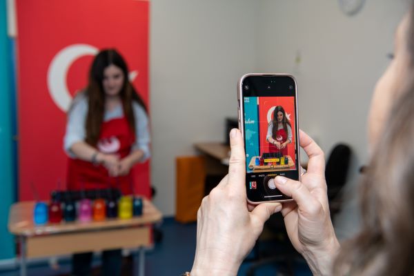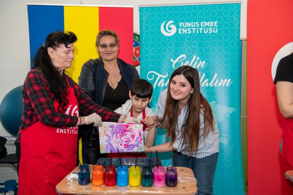 Çocuklar, T.C. Köstence Başkonsolosu Ozan Çakır ve Yunus Emre Enstitüsü Romanya Koordinatörü Mustafa Yıldız’ın da katılımıyla düzenlenen Ebru Sanatı Atölyesinde renklerin suyla dansını keşfettiler.