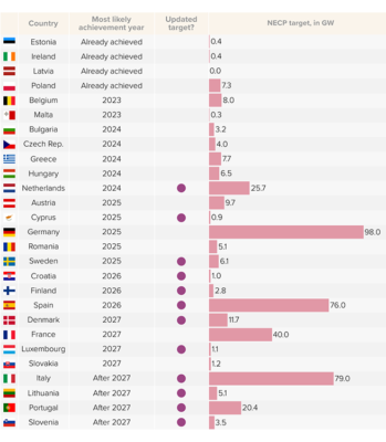 SolarPower Europe lobi grubunun mevcut en son ulusal hedeflere dayanan ve POLITICO ile paylaşılan verilerine göre, yaklaşık 23 ülkenin güneş enerjisi kurulum hedeflerine 2027 yılına kadar ulaşması planlanıyor.