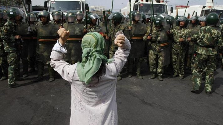 (Euronews / Fotoğraf: Çin paramiliter polisini protesto eden Uygur Türk'ü kadın- Urumçi -Foto AP arşiv)