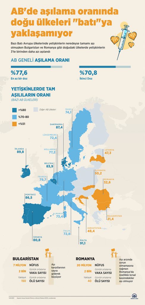 *Batı ülkelerinin çoğunda yetişkinlerde aşılama oranı yüzde 80'lere ulaşırken doğu ülkelerinden Bulgaristan'da yüzde 21, Romanya'da yüzde 32'de kaldı