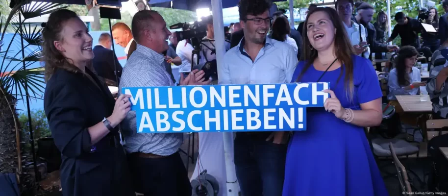 Brandenburg eyaletinde yapılan parlamento seçimlerinde yüzde 29,2 oy oranı ile, yüzde 30,9 oy alan SPD'nin (Sosyal Demokrat Parti) ardından ikinci olan aşırı sağcı Almanya için Alternatif (AfD) partisinin taraftarları, bu sonucu kutladıkları etkinlikte, sözleri "bütün gece eğleneceğiz" olan bir şarkıyı "herkesi sınır dışı edeceğiz" şeklinde değiştirerek söyledi.