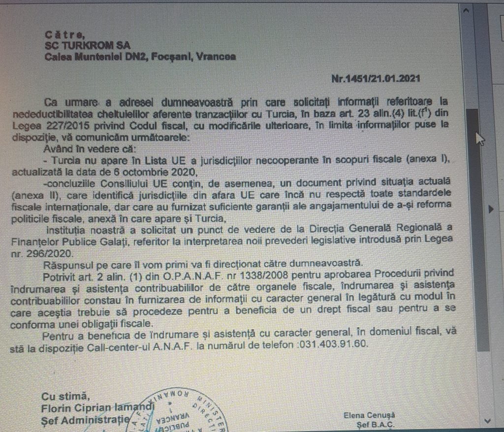 Romanya Gelir İdaresi Başkanlığı (ANAF), Romanya’da 18 Aralık 2020 tarihinde çıkartılan yasa ekindeki listede Türkiye’nin “Mali alanda işbirliği yapılmayan ülkeler” kategorisine konulması üzerine oluşan kaos ortamını getirdiği açıklama ile dağıttı.