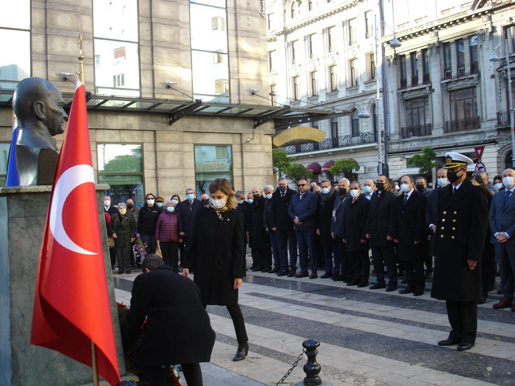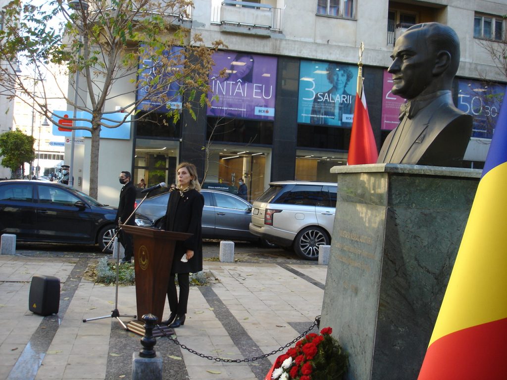Ardından Türkiye’nin Bükreş Büyükelçisi Füsun Aramaz Atatürk Büstü’ne çelenk koyarak saygı duruşunda bulunduktan sonra bir konuşma yaptı.