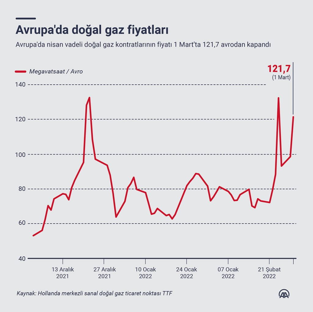 Avrupa'da derinliği en fazla olan Hollanda merkezli sanal doğal gaz ticaret noktası TTF'de işlem gören nisan vadeli kontratların fiyatı TSİ 16.45'te megavatsaat başına 168 avro oldu. Böylece geçen yıl megavatsaat başına 16 avro olan doğal gaz fiyatı 10 katına çıktı.