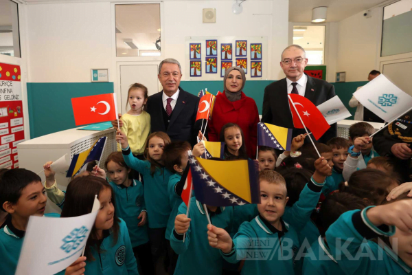 Okula gelişinde Bakan Akar'a yöresel kıyafetli anaokulu öğrencileri çiçek hediye etti. Bakan Akar, binaya girişinde ise ilkokul öğrencilerinin sürpriziyle karşılaştı. Ellerinde Türk ve Bosna Hersek bayrakları taşıyan minikler, Bakan Akar'ı "merhaba" adlı şarkıyı söyleyerek selamladı.