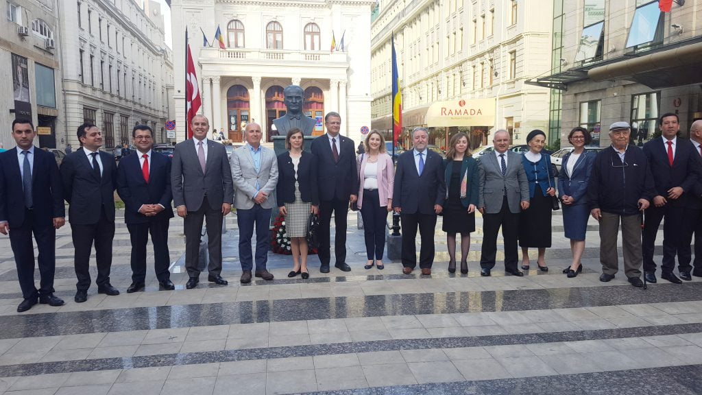 Saygı duruşu ve İstiklal Marşı'nın okunduğu törene, Bakan Yardımcısı Mehmet Emin Birpınar, Türkiye'nin Bükreş Büyükelçisi Füsun Aramaz ile bakanlık ve büyükelçilik yetkilileri de katıldı.