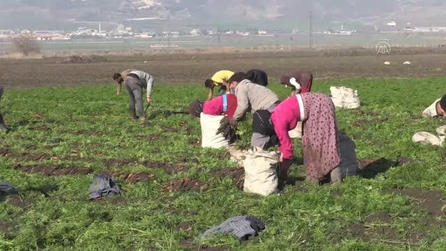 Sabahın erken saatlerinde Amik Ovası'ndaki çamurlu tarlalara gelen tarım işçileri havuçların sökümüne yaparak çuvallara dolduruyor.