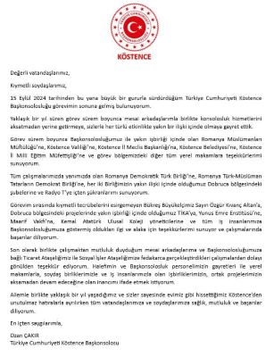 Başkosolos Çakır, bu vesile ile bir veda mesajı yayınlayarak görev bölgesindeki Rumen ve Türk makamları ile kurum ve kuruluşlara teşekkür etti.