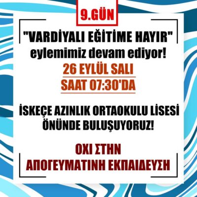 Batı Trakya Türkleri, 2023-2024 eğitim-öğretim yılında Yunanistan'ın dayattığı vardiyalı eğitim kararına gösterdiği sert tepkiyi sürdürüyor. 9 Eylül 2023'ten bu yana İskeçe Azınlık Ortaokulu-Lisesi önünde toplanan İskeçe Türk Birliği, Encümen Heyeti, Okul Aile Birliği, STK üyeleri, parti temsilcileri, öğrenciler ve veliler Yunanistan hükumetini protesto etti.