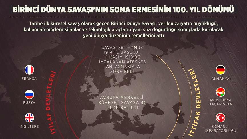 Fransa, İngiltere ve Rusya'nın merkezde olduğu İtilaf Devletleri ile Alman İmparatorluğu, Avusturya - Macaristan İmparatorluğu ve Osmanlı Devleti'nin oluşturduğu İttifak Devletleri'nin karşı karşıya geldiği savaştan İtilaf Devletleri galibiyetle ayrıldı. Savaşın neticesinde 17 milyon kişi hayatını kaybederken, 21 milyon kadar kişi yaralandı.