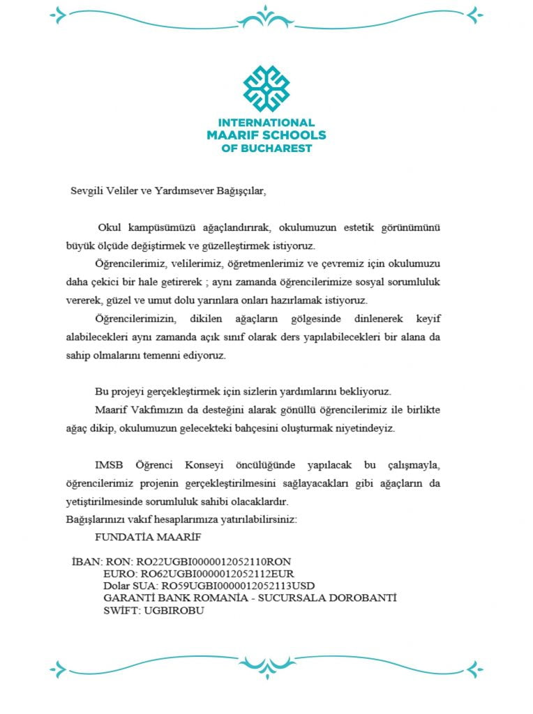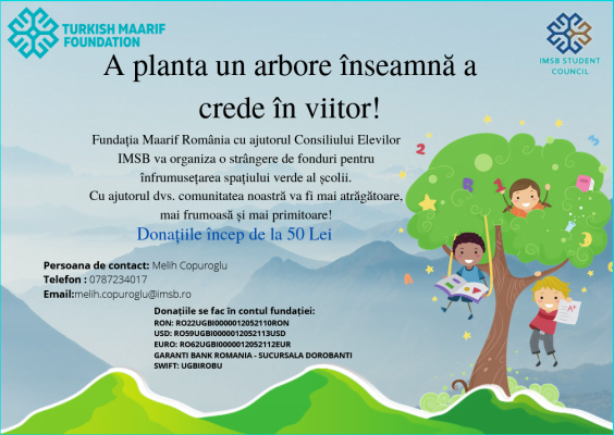 BÜKREŞ (Gazete Balkan) – Bükreş Uluslararası Maarif Okulu’nun (IMSB) bahçesinin ağaçlandırılması için bağış kampanyası açıldı.