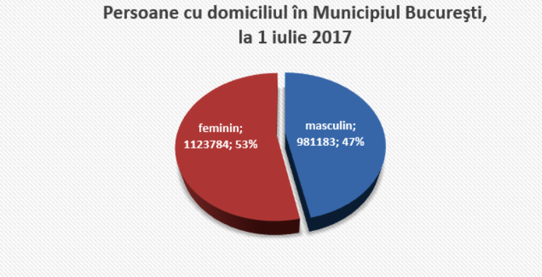 BÜKREŞ (Gazete Balkan)- 1 Temmuz 2017 tarihi itibarı ile 981 bin 183 (%46,61) erkek, 1 milyon 123 bin 784 (%53,39) kadın olmak üzere Bükreş’te toplam 2 milyon 104 bin 967 kişi yaşıyor.