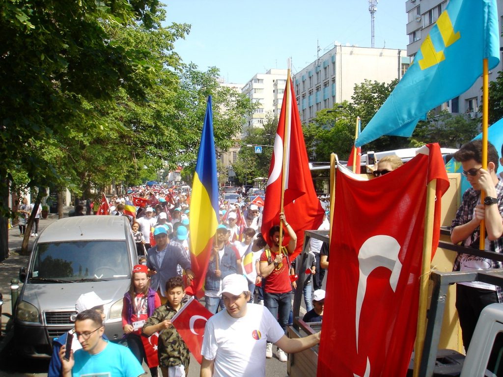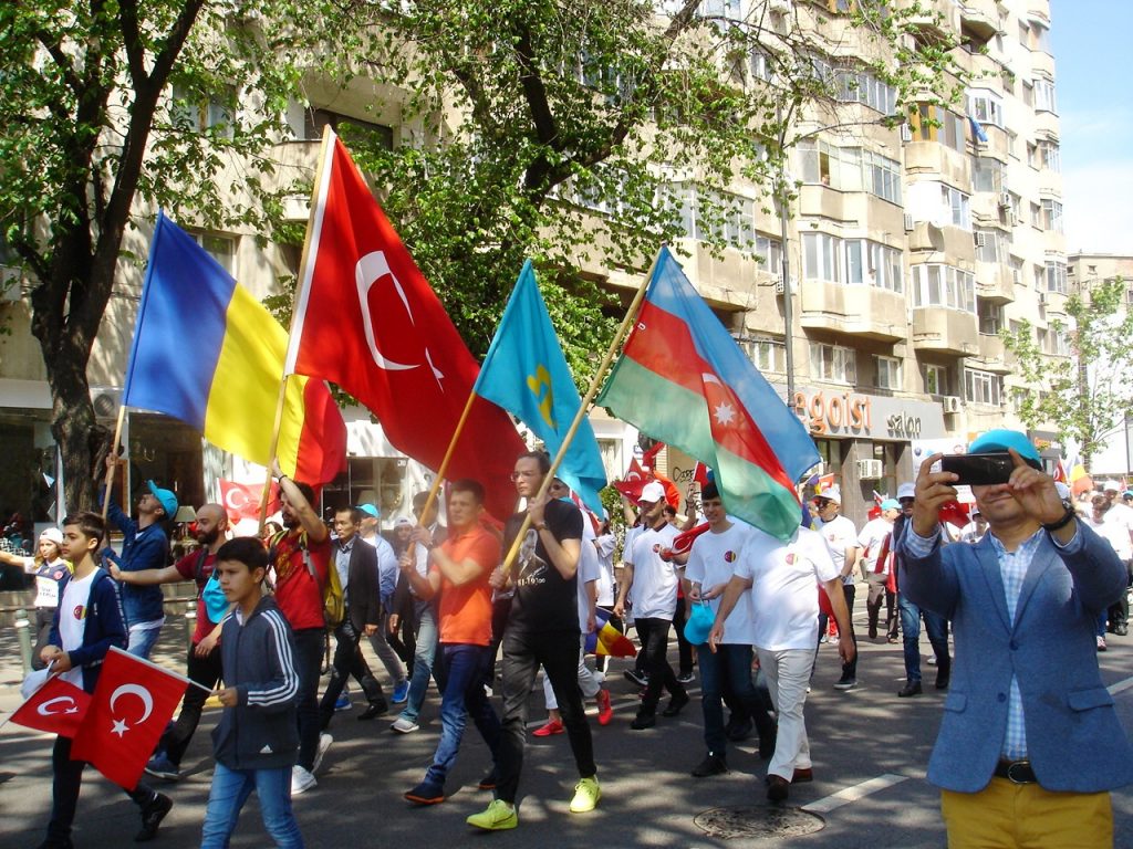 Türkiye, Romanya, Azerbaycan ve Kazakistan ve Türkmenistan bayraklarının taşındığı yürüyüş sırasında marşlar okundu, türküler söylendi.