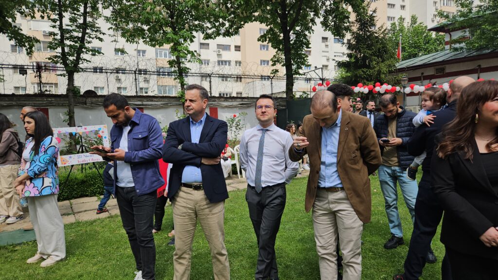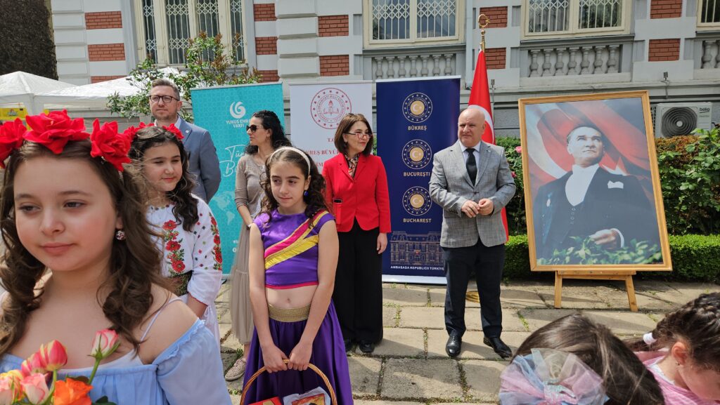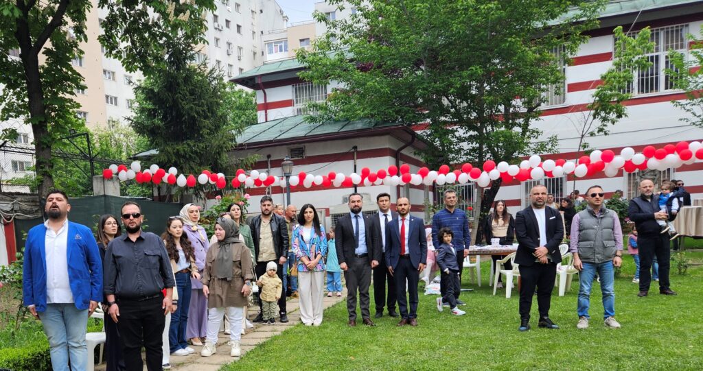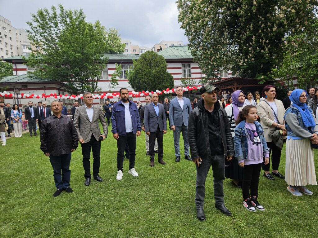 Bükreş Büyükelçiliği ikametgahı bahçesinde düzenlenen kutlama törenine Büyükelçilik mensupları, Büyükelçiliğe bağlı kurum ve kuruluş mensupları, STK temsilcilerinin yanı sıra yüzlerce öğrenci ve öğrenci velisi katıldı.