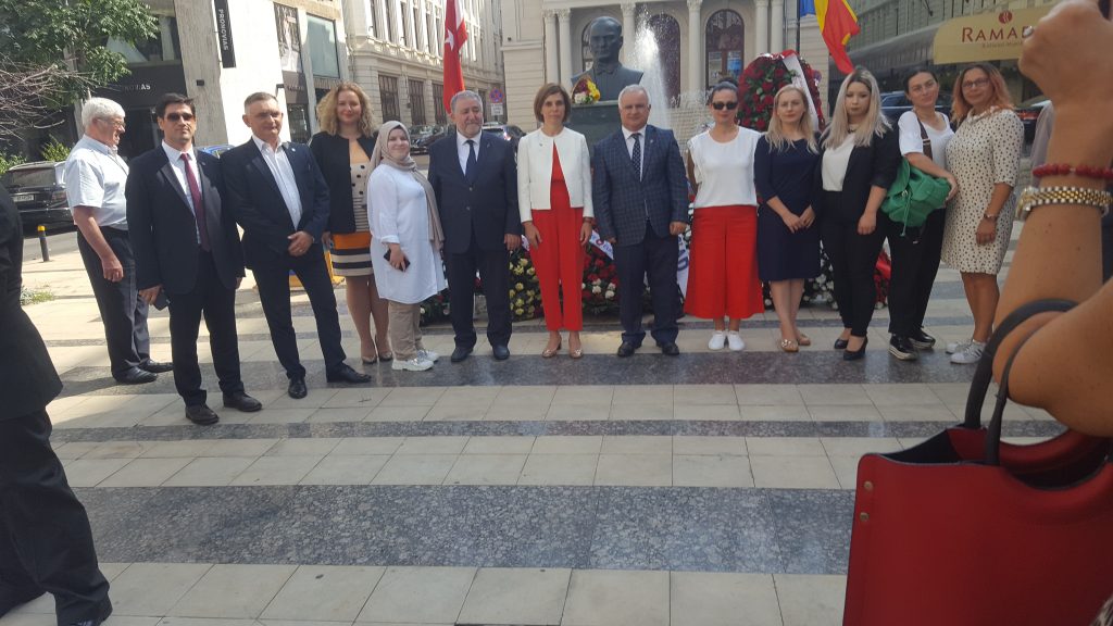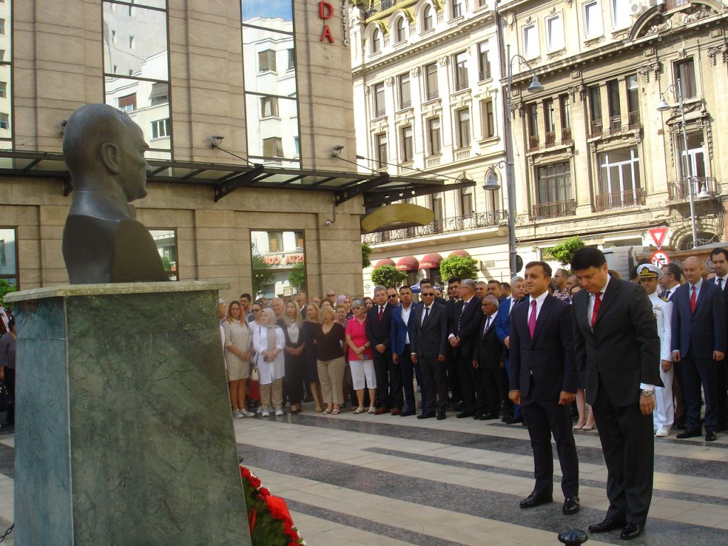 BÜKREŞ (Gazete Balkan)- Zafer Bayramı Bükreş’te düzenlenen törenlerle kutlandı. Başkumandanlık Meydan Muharebesi’nin 97. yılı dolayısı ile ilk tören Calea Vivtoria üzerindeki Atatürk Büstü başında Türk ve soydaş sivil toplum kuruluş temsilcilerinin katılımı ile gerçekleşti. Buradaki törende saygı duruşunda bulunularak, başta Bükreş Büyükelçisi Füsun Aramaz ve Azerbaycan Dr. Hüseyin N. Necefov olmak üzere Türk ve soydaş sivil toplum kuruluşları ile bazı özel kuruluşlar tarafından Atatürk büstüne çelenkler konularak saygı duruşunda bulunuldu, İstiklal Marşı okundu.