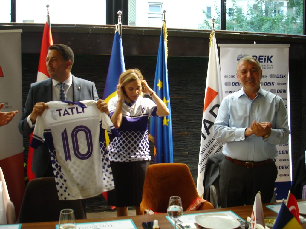Daha sonra Romanya’nın Türk yatırımlarının yoğun olduğu Argeş vilayetinden olan Argeş Milletvekili ve Temsilciler Mecilis Türkiye Dostluk Gurubu Başkanı Nicolae Georgescu, Büyükelçi Füsun Aramaz ve TBMM Futbol Takımı Başkanı Adem Tatlı’ya Argeş Spor’un renklerinden oluşan ancak üzerlerine isimlerinin yazıldığı birer forma hediye etti.
