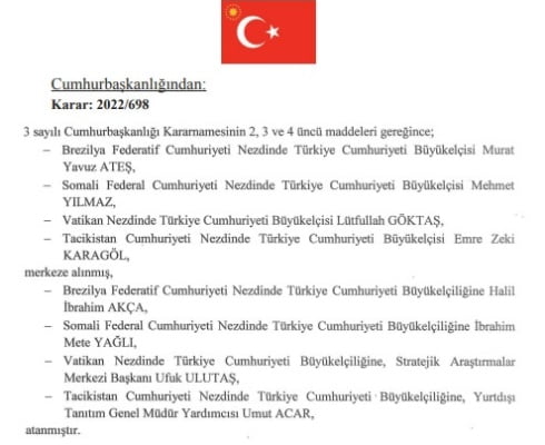 Bir Başka atama kararıyla da Brezilya, Vatikan, Somali ve Tacikistan Büyükelçileri merkeze çekilerek yerlerine yeni atama yapıldı.