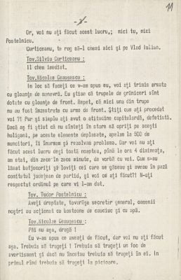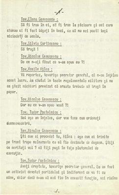 - Nicolae Ceausescu: Yani önerilen önlemi kabul etmiyor musunuz? Sonra (kağıtları önüne çarparak ve sandalyesinden kalkarak), başka bir genel sekreter seçin! (Kapıya yürür, o noktada Silviu Curticeanu onu takip eder ve ona şöyle söyler: Öyle değil, genel sekreter yoldaş. Seni asla terk etmeyeceğim, her zaman senin yanında kalacağım.