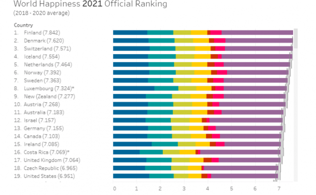 Birleşmiş Milletler Sürdürülebilir Kalkınma Çözümleri Ağı’nın hazırladığı rapora göre, Finlandiya, Danimarka, İsviçre ve İzlanda ilk dört sıradaki yerlerini korudu. Geçen rapor döneminde 5. sırada yer alan Norveç 6. sıraya gerilerken, Hollanda 5. sıraya yükseldi.