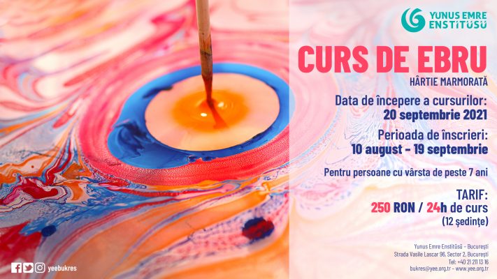 Geleneksel Türk sanatlarından olan ebru sanatı, yüzlerce yıldır yaşatılmış ve farklı alanlarda kullanılmıştır. Pek çok farklı malzemenin kullanıldığı ebru sanatı, geleneksel Türk sanatlarından biridir ve özellikle Osmanlı döneminde çok sayıda eser verilmiş ve seçkin ebru sanatkârı yetiştirilmiştir. Görsel olarak oldukça etkili bir his yaratan ebru sanatını bugün Romanya’da açacağı kurs ile Bükreş Yunus Emre Enstitüsü halkla buluşturacaktır. Ayrıntılı bilgiyi Bükreş Yunus Emre Enstitüsünden ve sosyal medya hesaplarından alabilirsiniz.