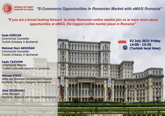 Romanya'nın en büyük online satış platformu olan e-MAG ile firmalarımızı bir araya getirme imkanı sunan "Romanya Pazarı E-Ticaret Fırsatları" webinarı 2 Temmuz 2021 tarihinde saat 14.00'te online olarak gerçekleştirilecek.