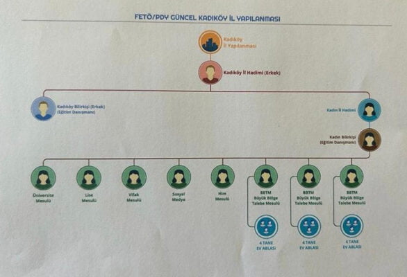 Ekipler yaptıkları çalışmada, FETÖ'nün yeni yapılanma şemasında "İl" olarak ayırdıkları yerlerde eğitim, lise, sosyal medya, hukuk ve iktisadi bilimler için erkek ve kadınlara ayrı ayrı sorumlular görevlendirdiği tespit edildi.