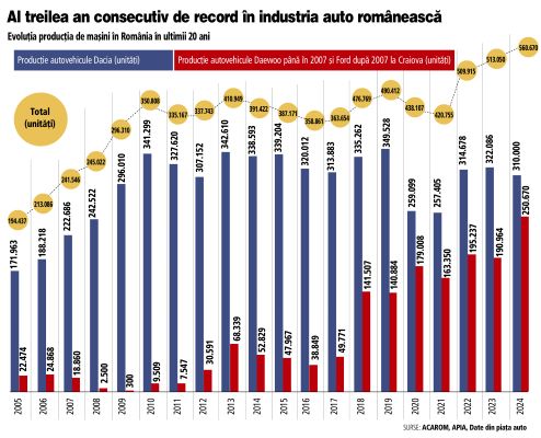 Böylece Romanya'da otomobil üretimi, Avrupa endüstrisi için özellikle zor ve iddialı bir yıl olan 2024'te yeni bir rekora imza atmış oldu. 2024’teki üretim 2023 yılına kıyasla yüzde 9,17’lik bir artışa karşılık geliyor.