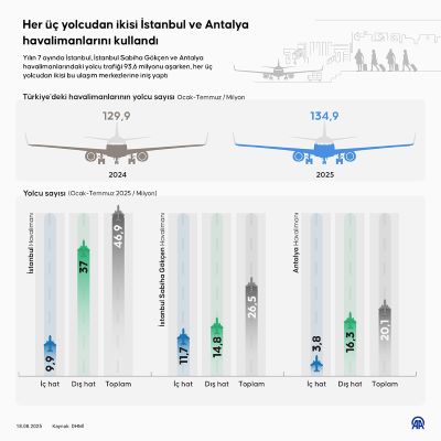 İstanbul, İstanbul Sabiha Gökçen ve Antalya havalimanlarındaki 7 aylık yolcu sayısı 93 milyon 637 bin 727 olarak hesaplandı. Buna göre, söz konusu havalimanları, Türkiye'ye gelen ve gidiş yapan her üç yolcudan ikisini ağırladı.
