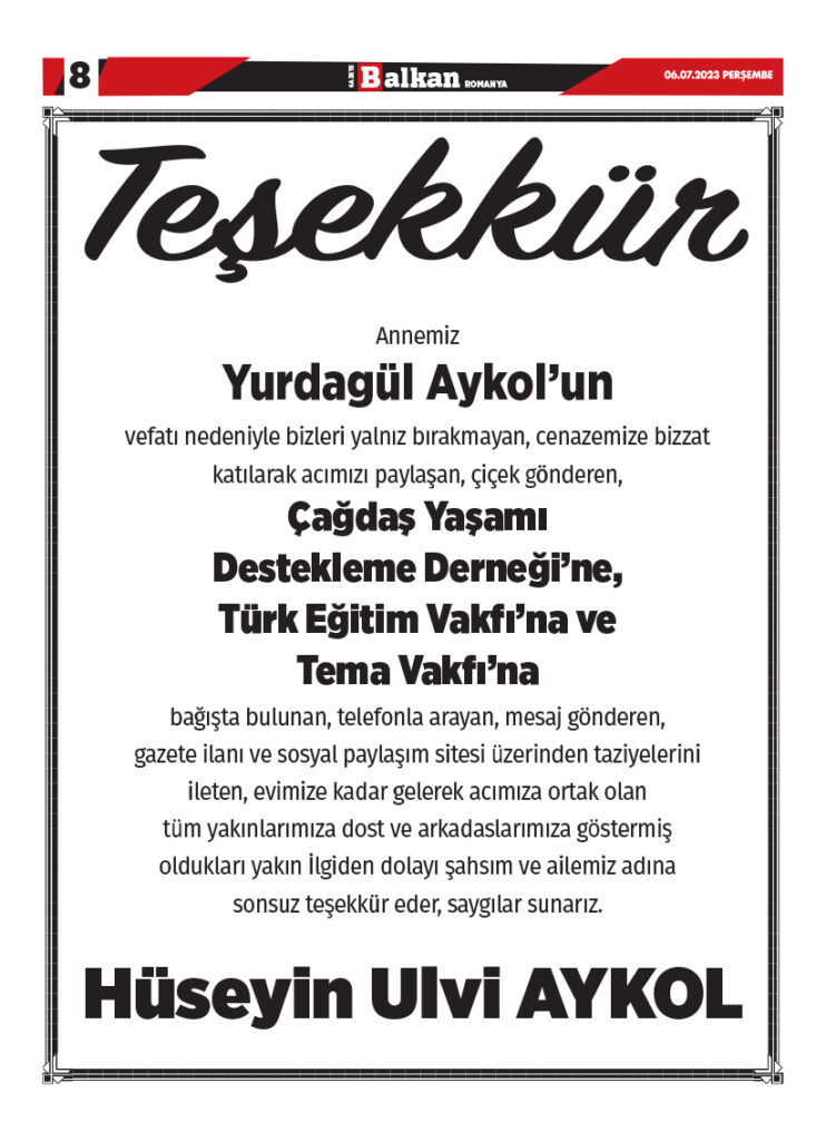 Hüseyin Ulvi Aykol'dan Teşekkür Mesajı