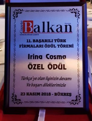 Aynı yıl Gazete Balkan’ın 11. Başarılı Türk Firmaları Ödül törenine davet edilerek ‘Özel Ödül’ ile ödüllendirilen ve Türk İş adamı Levent Atin tarafından ailesi ile birlikte Bükreş’te misafir edilen İrina Cosma, kendi ifadesi ile Türk Bayrağı’nın “Ay Yıldızı” gibi parlamaya devam ediyor.