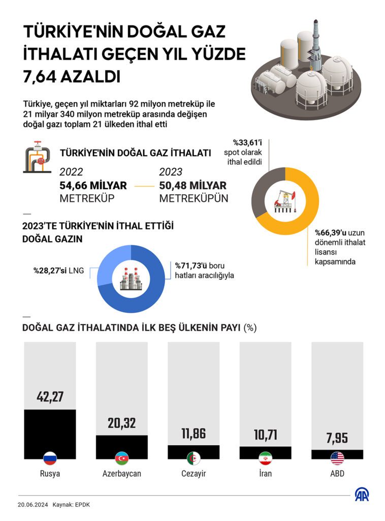 Türkiye'nin geçen yıl ithal ettiği 50,48 milyar metreküp doğal gazın yüzde 71,73'üne denk gelen 36,21 milyar metreküpü boru hatları aracılığıyla satın alınırken, yüzde 28,27'ye denk gelen 14,27 milyar metreküp kısmı LNG olarak satın alındı. Türkiye, doğal gaz ithalatını 21 farklı ülkeden gerçekleştirdi.