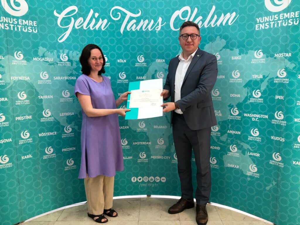 2023 yılının ilk dönemini başarıyla tamamlayan katılımcılara sertifikaları düzenlenen törenle Bükreş Yunus Emre Enstitüsü Müdürü Mustafa Yıldız ve kaligrafi eğitmeni Duygu Sarpkaya tarafından takdim edildi.