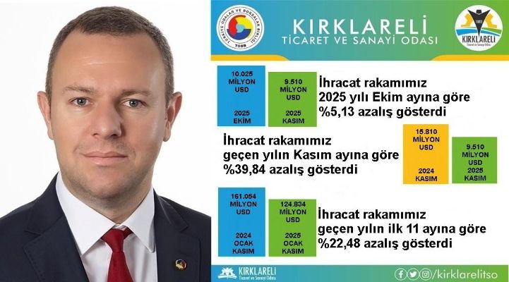 “Kırklareli merkezli firmalar 2025 Kasım ayında 9.510 milyon dolar ihracat rakamına ulaştı. 2025 yılı Kasım ayında ilimizden yapılan İhracat 2025 yılı Ekim ayına göre %5,13 azalış, 2024 yılının Kasım ayına göre ise de %39,84 azalış gösterdi. 2025 yılının ilk 11 ayında Kırklareli’nden yapılan ihracat rakamı toplamı 124.834 milyon dolara yükselerek, 2024 yılının ilk 11 ayına kıyasla %22,48’lik bir azalış gösterdi.
