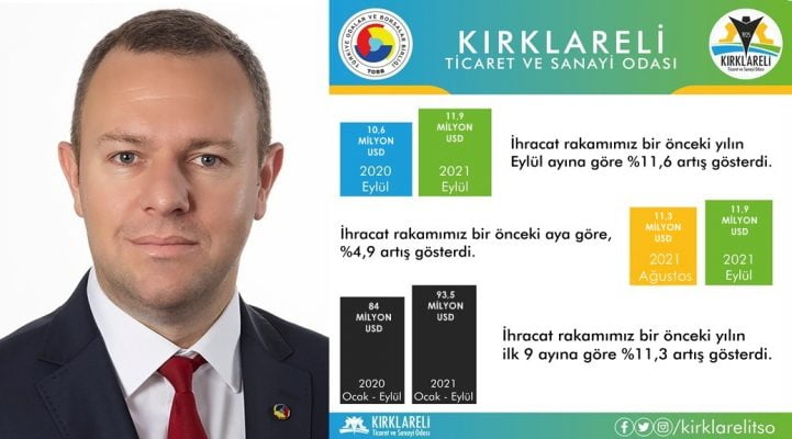 “Kırklareli merkezli firmalar 2021 Eylül ayında 11,9 milyon dolar ihracat rakamına ulaştı. Eylül ayında ilimizden yapılan ihracat bir önceki aya göre yüzde 4,9, geçtiğimiz yılın aynı ayına göre ise yüzde 11,6 artış gösterdi. Pandemi etkilerinin azalmasıyla birlikte 2021 yılının ilk 9 ayında Kırklareli’nden yapılan ihracat rakamı toplamı 93.5 milyon dolara yükselerek 2020 yılına kıyasla yüzde 11,3’lük bir artış gösterdi.