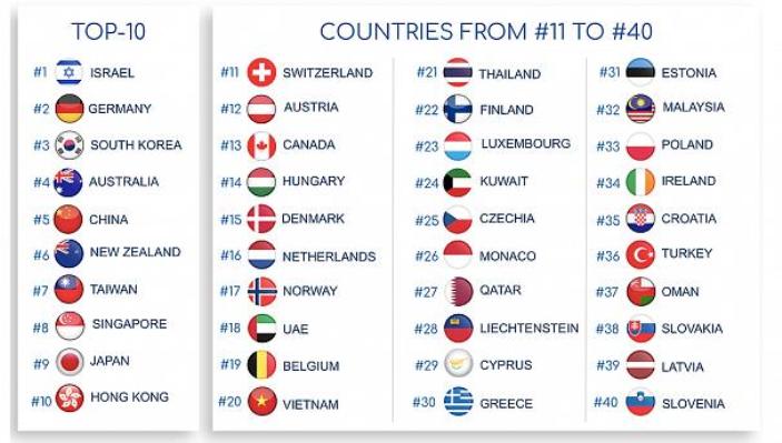 Raporda ilk sıradaki İsrail, ikinci sıradaki Almanya ile dokuzuncu sıradaki Japonya ile ilgili ayrıntılı bilgi veriliyor.