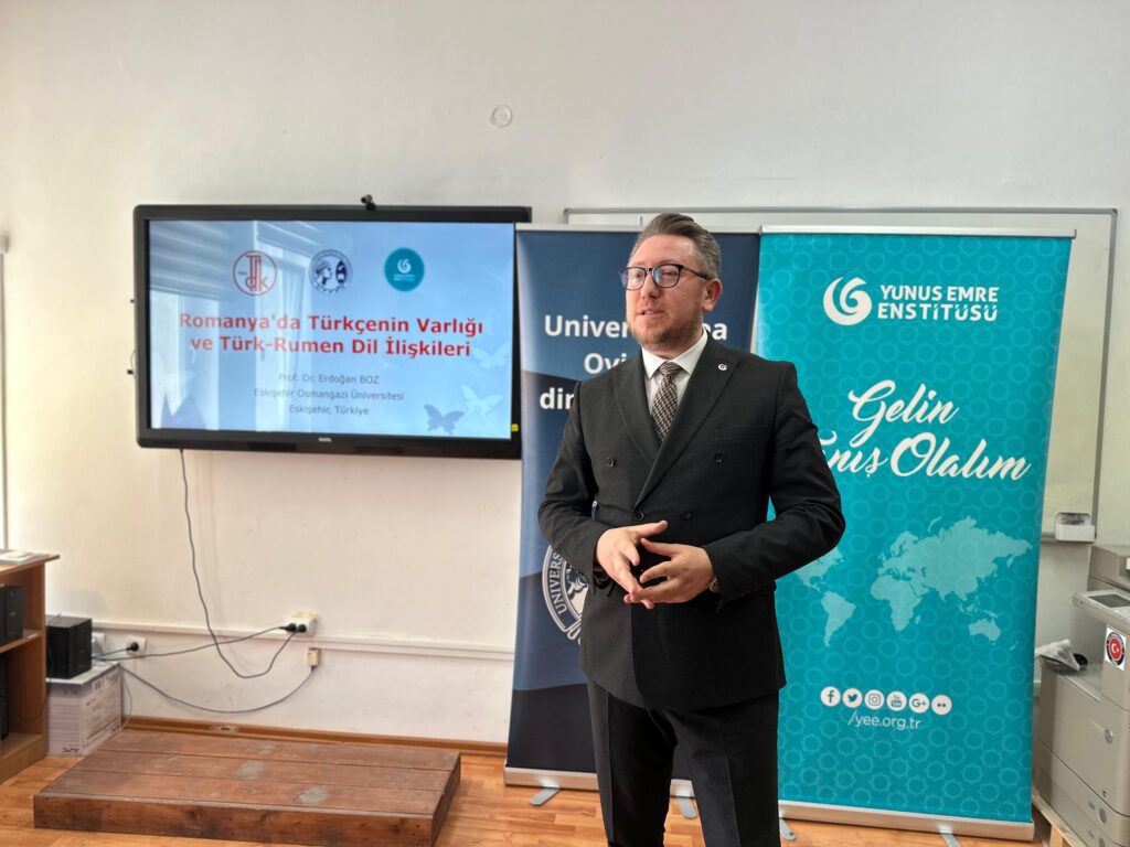 Yunus Emre Enstitüsü ve Köstence Ovidius Üniversitesi Edebiyat Fakültesi tarafından, Türk Hava Yolları ve Türk Dil Kurumunun katkılarıyla gerçekleştirilen “Romanya’daki Türkçe Varlığı, Türk-Rumen Dil İlişkileri” konulu konferans, Eskişehir Osmangazi Üniversitesi Yeni Türk Dili Anabilim Dalı Başkanı Prof. Dr. Erdoğan Boz tarafından verildi.