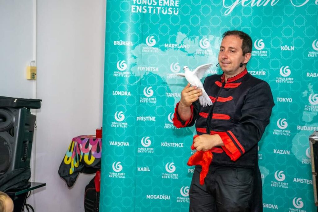 Ebru etkinliğinin ardından sihirbaz tarafindan şapkadan çıkarılan güvercin ve elinde bir anda beliren tavşan ve sincap; hem çocukları hem de ailelerini şaşkına çevirdi.