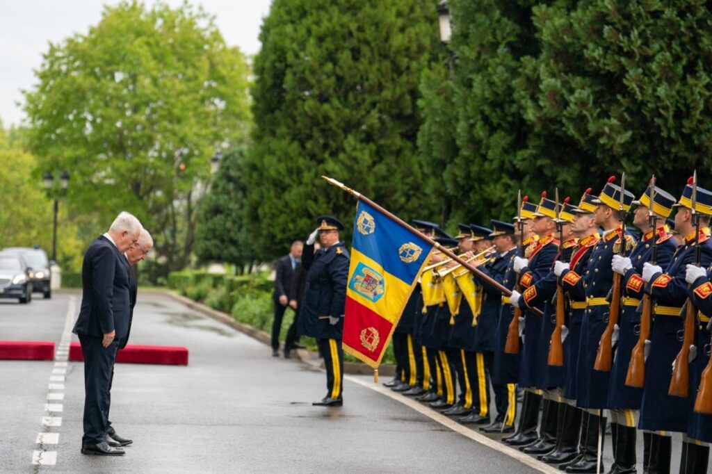 Romanya Savunma Bakanlığına gelişinde askerî tören ile karşılanan Bakan Yaşar Güler, iki ülke marşlarının çalınmasının ardından şeref kıtasını selamladı.