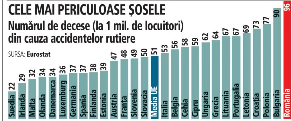Karşı kutupta Romanya, ardından bir milyon kişi başına trafik kazaları nedeniyle 90 ölümle Bulgaristan ve 77 kurbanla Polonya yer alıyor. Avrupa Birliği'nde trafik kazaları nedeniyle milyon kişi başına ortalama ise 51 ölüm. (Ziarul Financiar)