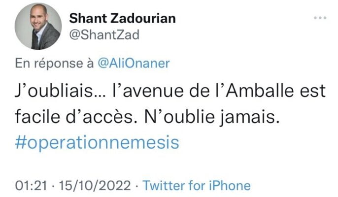 Eski LCI gazetesi komünikasyon direktörü olan Zadourian, Türkiye Cumhuriyeti Paris Büyükelçiliğinin sokağından bahsederek, “Unutuyordum, l’Amballe caddesine kolayca erişilebilir, operasyon Nemesis’i hiçbir zaman unutma” şeklinde tehditkâr ifadeler kullandı. Zadourian paylaşımının ardından hesabını korumaya aldı.