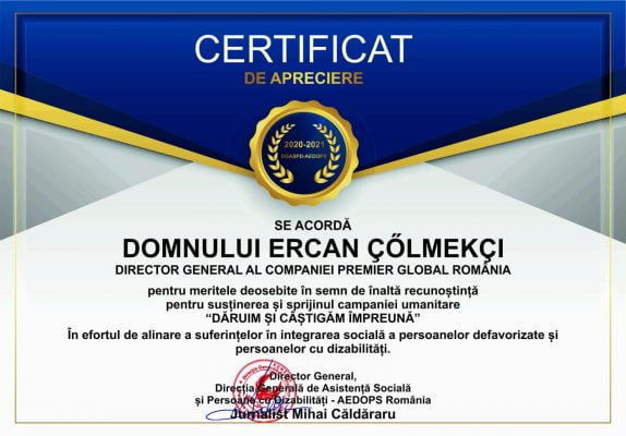 Romanya’da faaliyet gösteren Türk firması Premier Global Romania firmasına ülkedeki üç çocuklarla ilgili yardım kuruluşlarından teşekkür plaketi gönderildi.