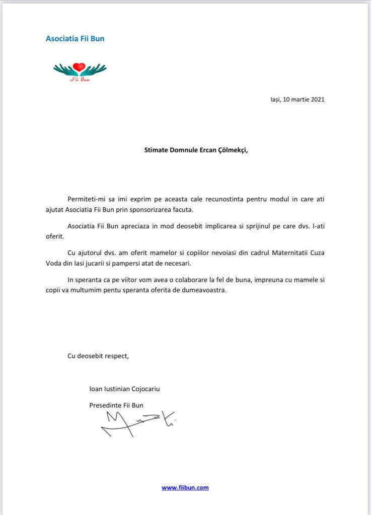 Geçen Aralık ayından bu yana Iaşi, Banat Bölgesi ve Bükreş’te kimsesiz çocuklarla ilgili üç yardım kuruluşuna yapılan yardımlardan dolayı ilgili kuruluşlar tarafından firma sahibi Ercan Çölmekçi’ye teşekkür belgeleri gönderildi.
