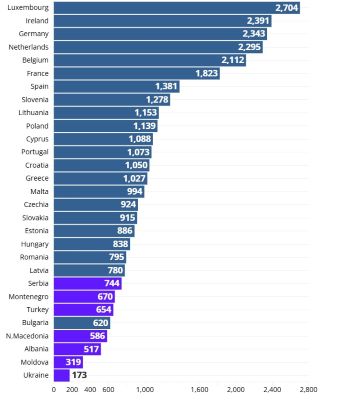 AB’de asgari ücretin 1.500 Avro’nun üzerinde olduğu ülkeler ise genellikle Batı Avrupa’da yer alıyor. Bu ülkeler ve ücretleri şöyle: Fransa (1.823 Avro), Belçika (2.112 Avro), Hollanda (2.295 Avro), Almanya (2.343 Avro), İrlanda (2.391 Avro) ve Lüksemburg (2.704 Avro).