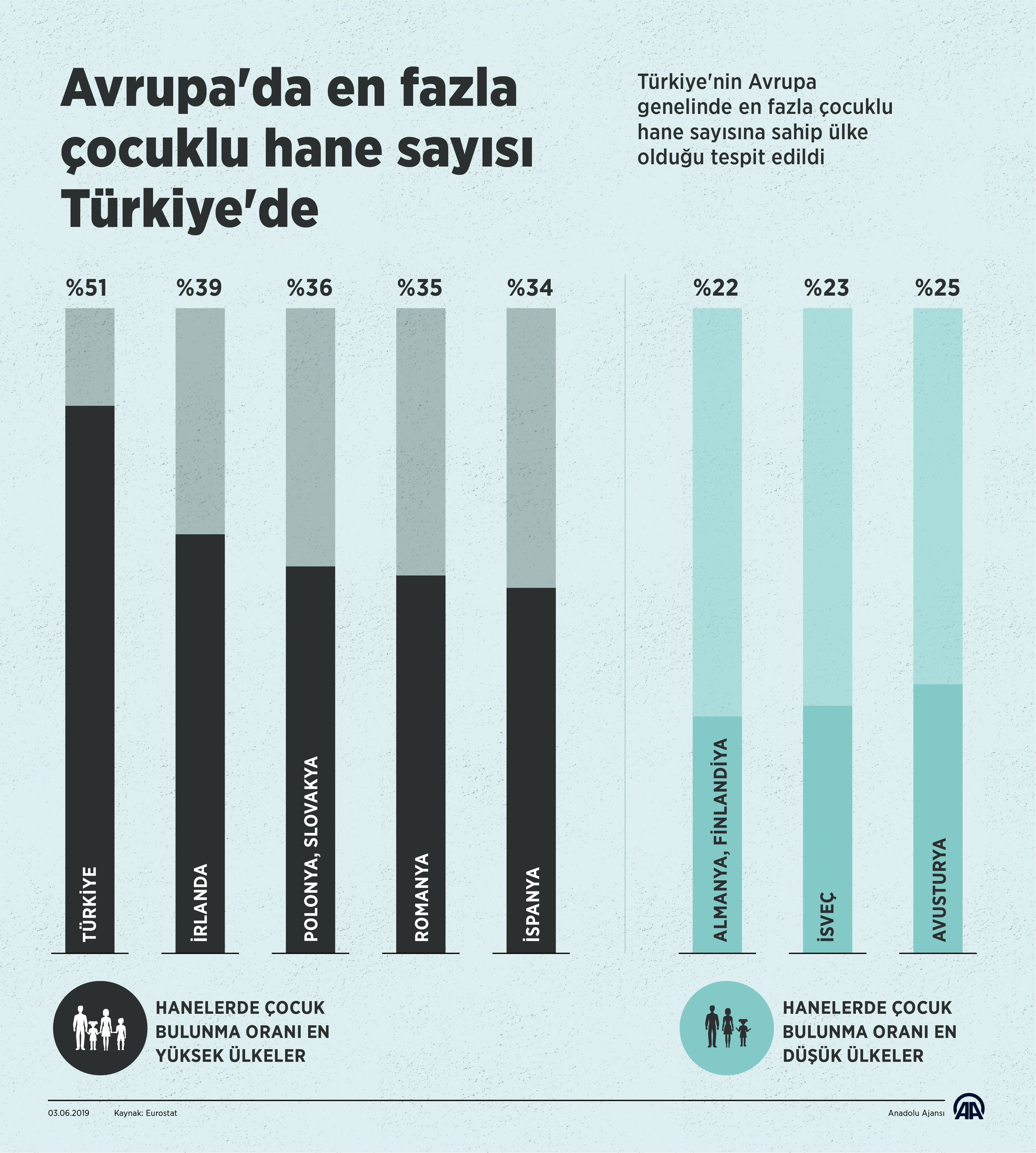 Verilere göre, Türkiye'deki hanelerin yüzde 51'inde çocuk bulunurken, Türkiye'yi İrlanda (yüzde 39), Polonya ve Slovakya (yüzde 36), Romanya (yüzde 35) ve İspanya (yüzde 34) izledi.
