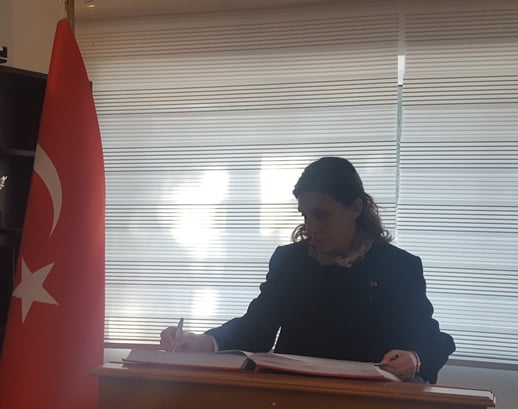 Büyükelçi Aramaz ve TSK Ataşesi Dilsiz ile diğer katılımcılar şehit kabirlerine gül bırakarak dua ettiler. Büyükelçi Aramaz Şehitlik defterine yazdı.
