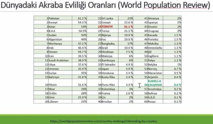 Dünya genelinde en çok akraba evliliği oranı yüzde 61,2 oranı ile Pakistan’da olurken ikinci sırada yüzde 54,3 oranı ile Kuveyt yer aldı. 60 ülkenin yer aldığı listede Türkiye yüzde 21,1 oranı ile 23’üncü sırada yer aldı.