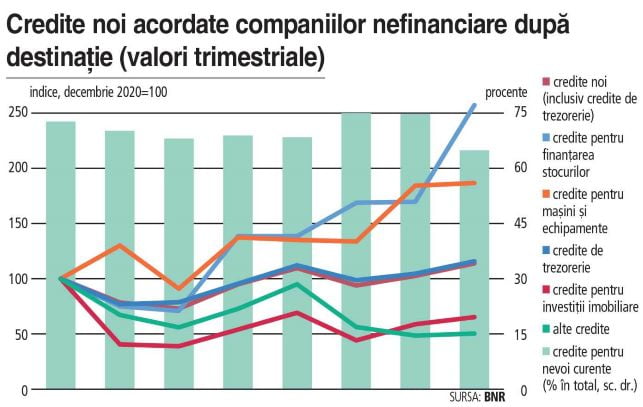 Şirketlerin makine ve teçhizat için akdettiği kredilerin akışında önemli artışlar kaydedildi, ancak yatırımların finansmanına mütevazı bir katkıları var. Romanya İstatistik Enstitüsü (INS) verilerine göre 2020'de Şirketlerin makine ve teçhizat maliyetlerinin yüzde 6’sı banka kredileri ile finanse edildi. Yatırımların çoğu (%75) şirketlerin kendi öz kaynaklarından finanse ediliyor.