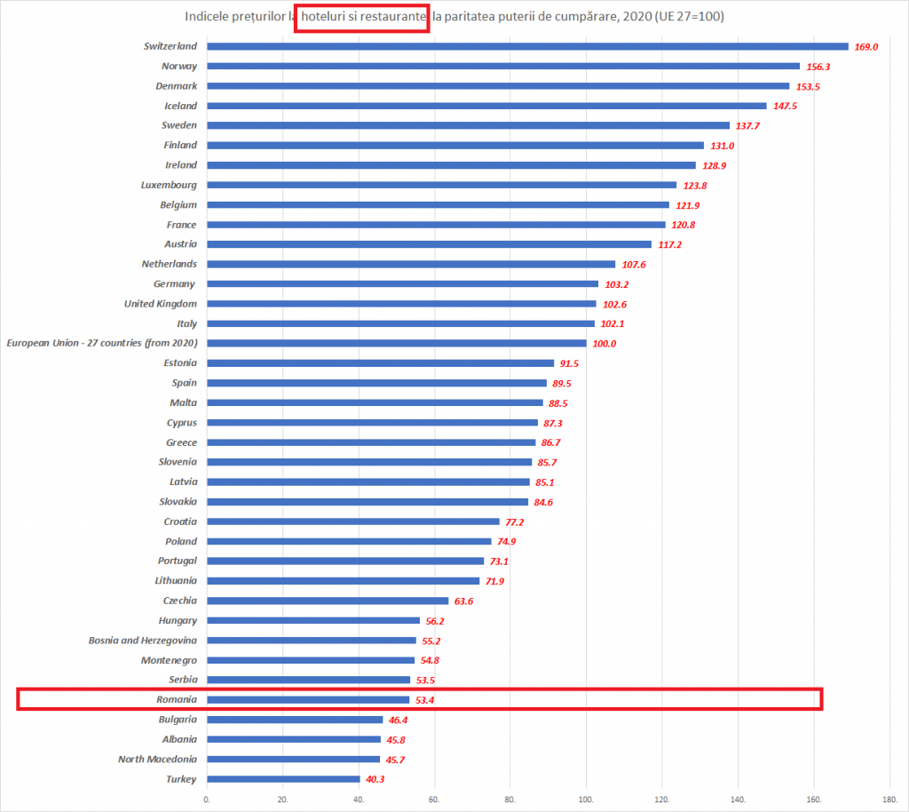 Otel ve restoran fiyatlarını alalım. Burada konaklama koşullarından, garsonların nezaketinden veya otelcilerin misafirperverliğinden bahsetmiyoruz. Sadece fiyatlara bakıyoruz. Grafik, yukarıdakine benzer bir anahtarla okunmalıdır. AB'de bir otelde ortalama gece 100 lei ise, Romanya'da 53.4 ley, Türkiye'de 40,3 ley ve İsviçre'de 169 ley'dir.