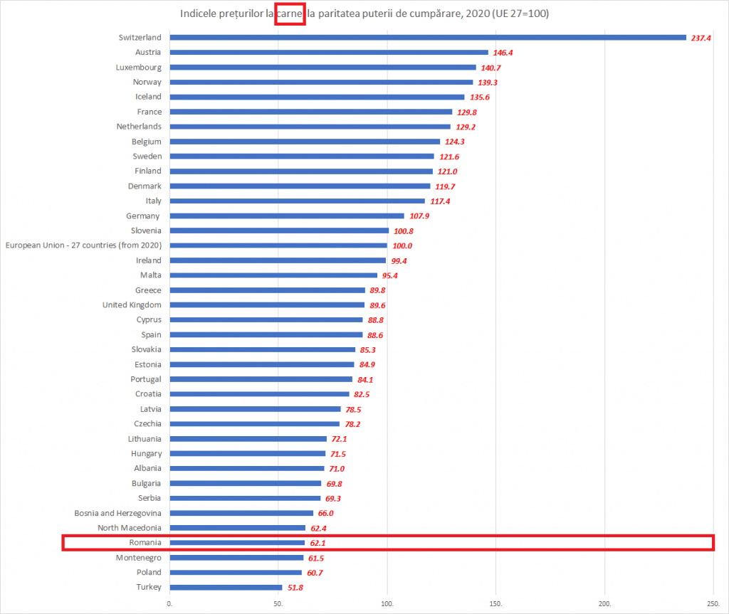 Rumenler, Bulgarlar ve Türklerle birlikte Avrupa'daki ücretlerle uyumlu olsalar da, bir kilogram et için Polonyalılardan veya Karadağlılardan daha fazla ödüyor.